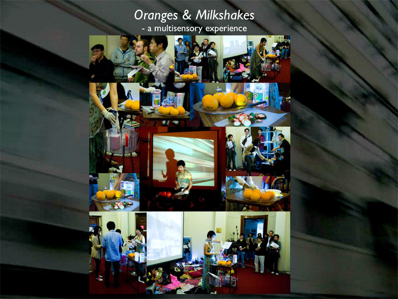 Hypersensitivity thus predisposes me towards interest in multi-sensory artistic expression, as an extension of my reality. In the segment Oranges and Milkshakes, with a silent looping video of busy city streets in the background, I served freshly cut oranges and blended strawberry milkshakes to the audience, while drawing their attention to the sounds, images, textures, tastes and smells in daily life which are ignored and pushed to the subconscious. For an individual with hypersensitivity, the mundane and innocuous can become inordinately amplified.