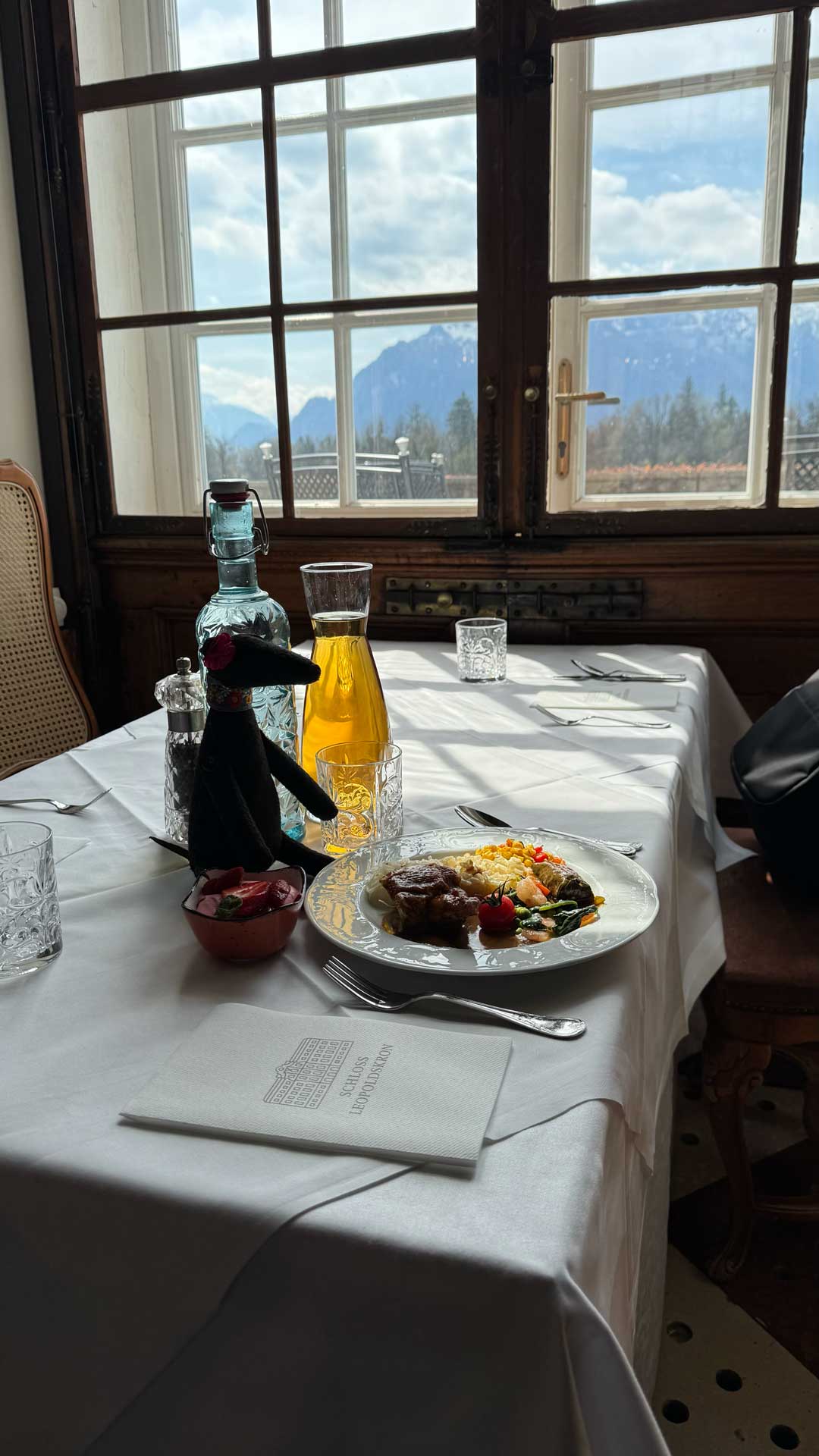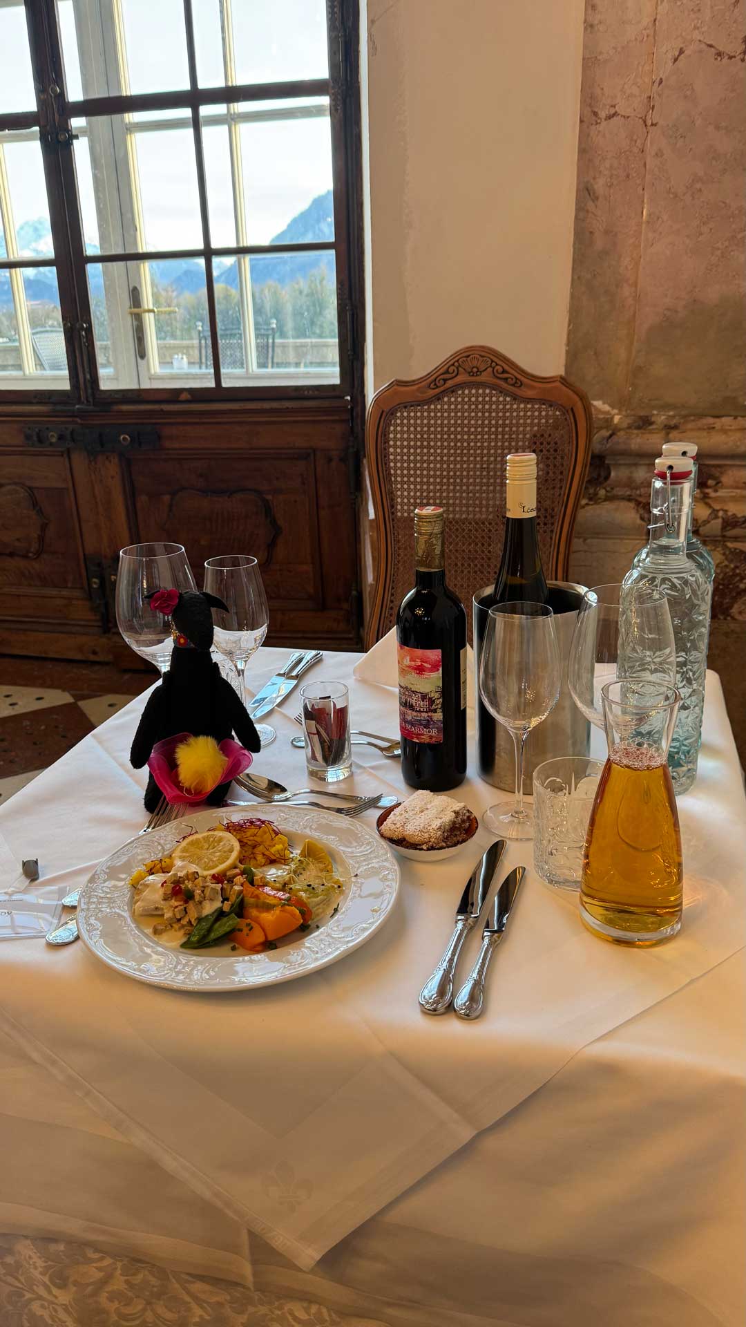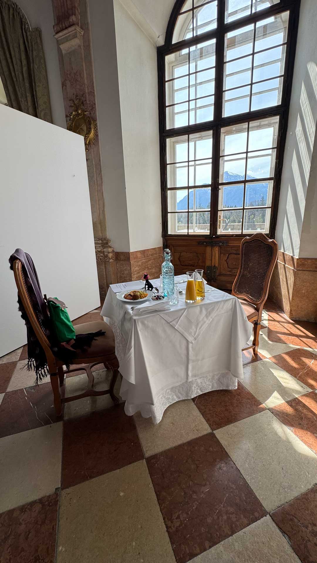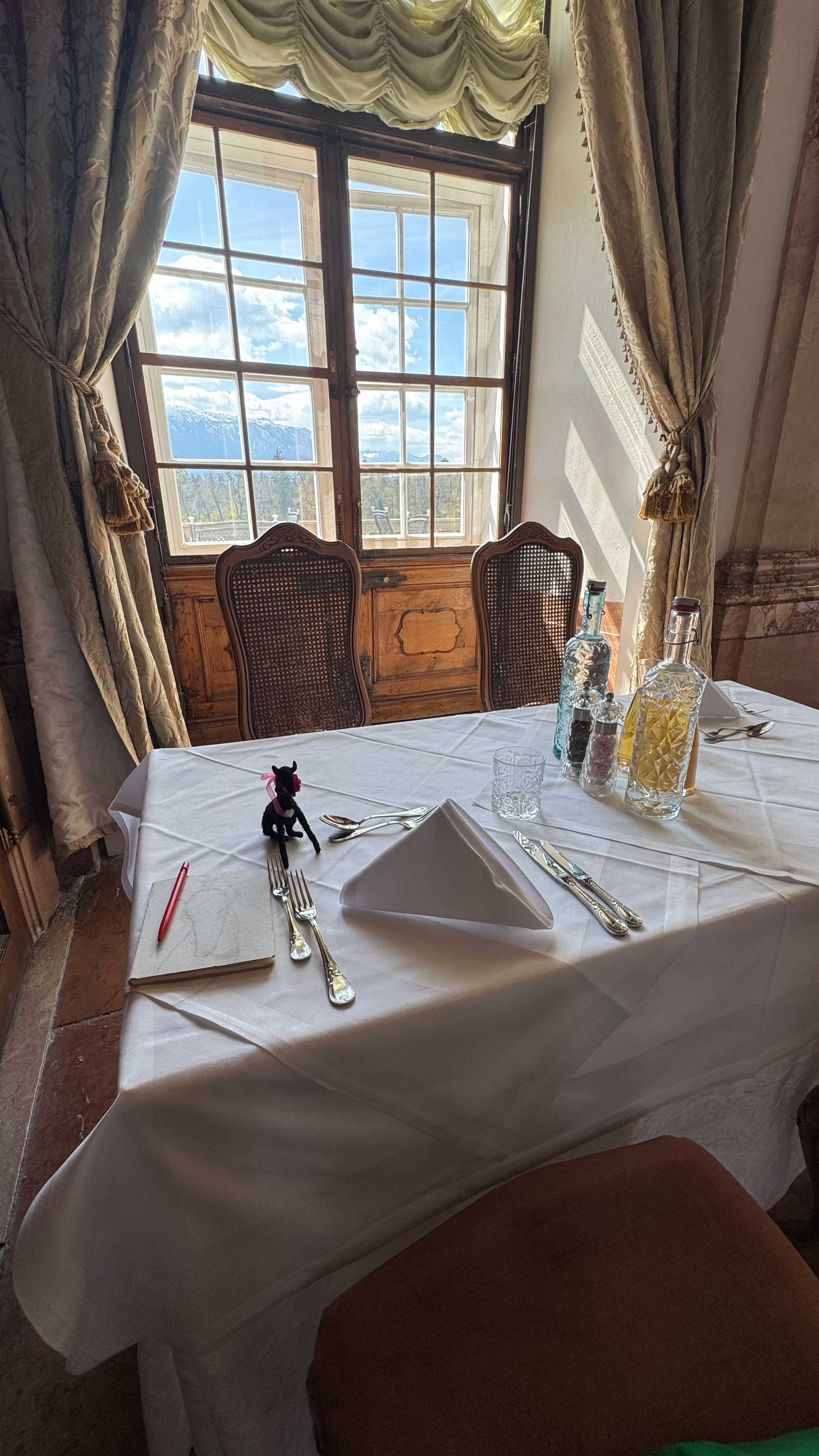 Here are photos of Lucy-stuffy and Lucy-feltie at our delightful “quiet table” in the gorgeous Marble Hall of the Schloss Leopoldskron.
