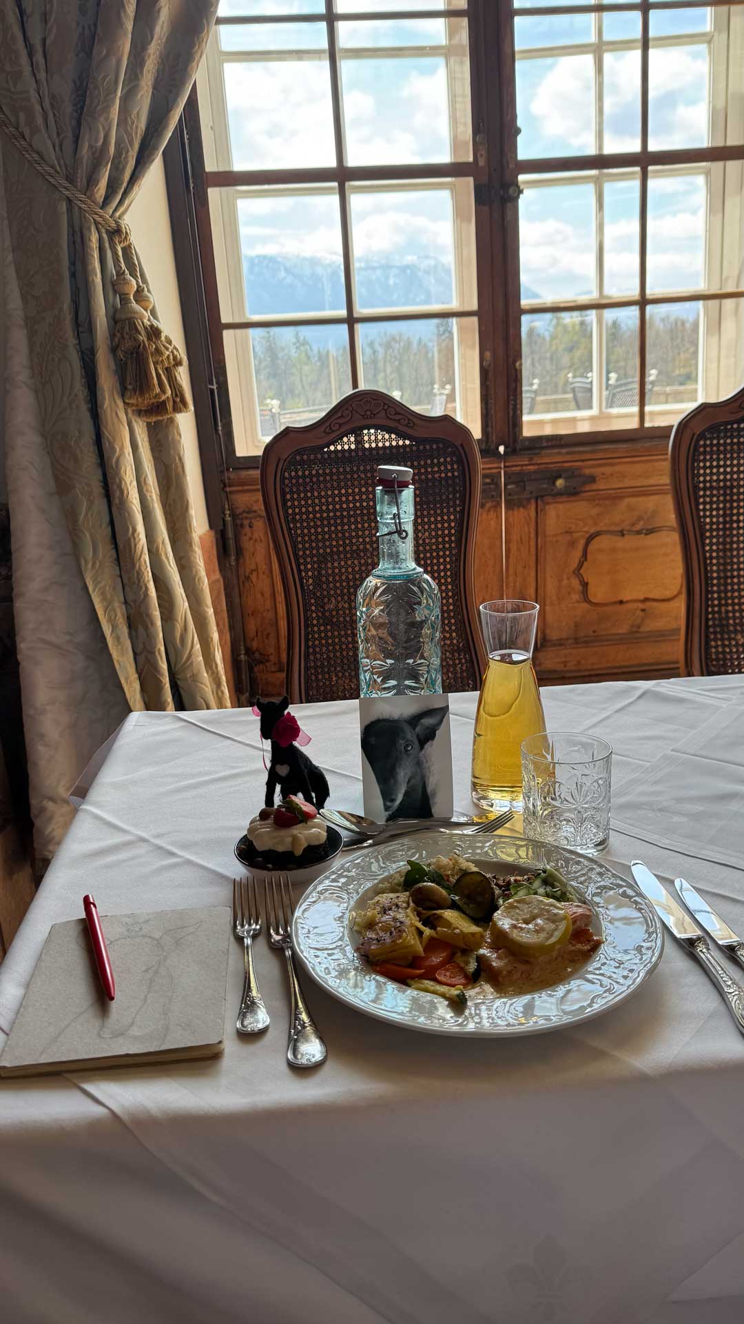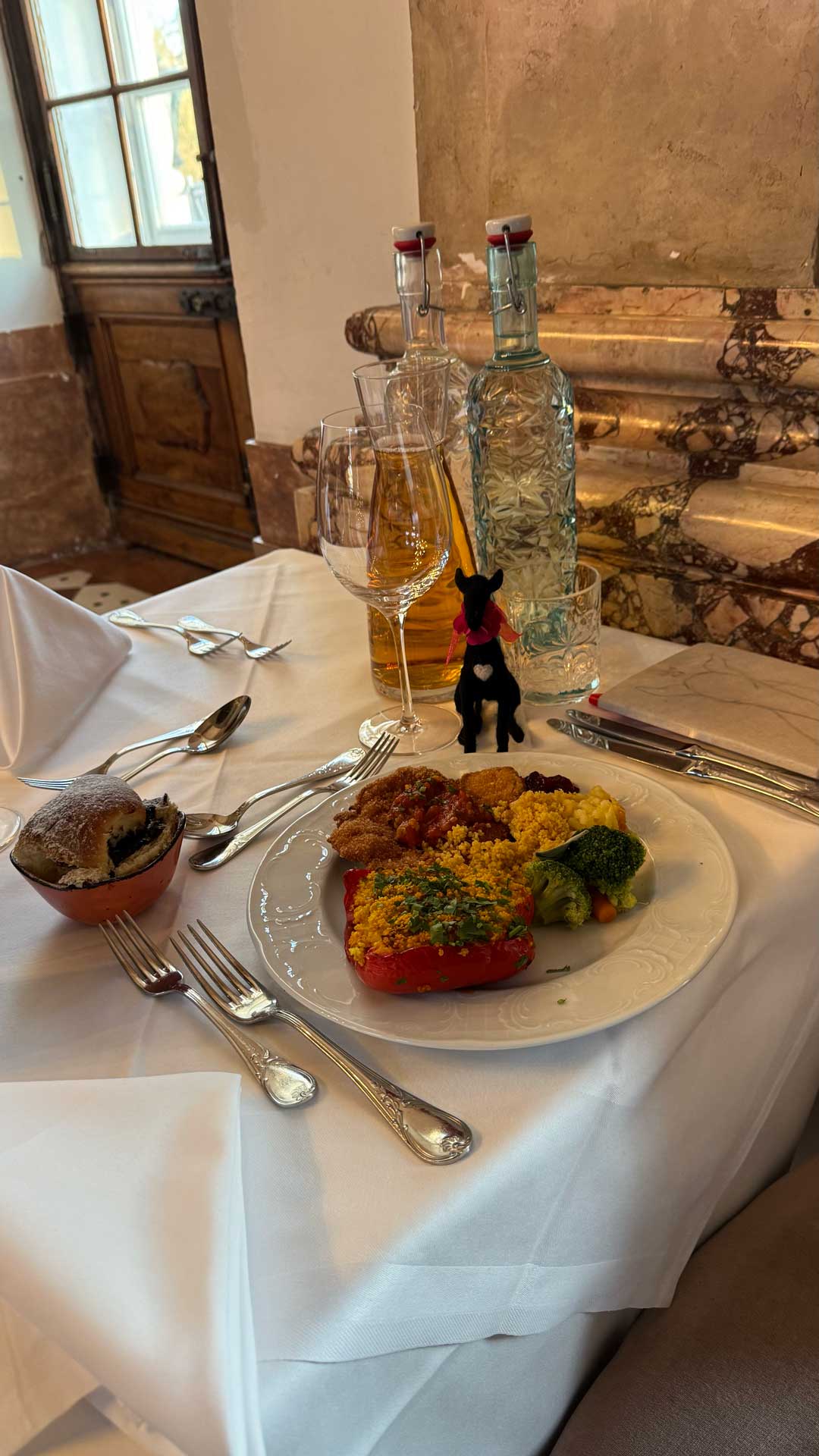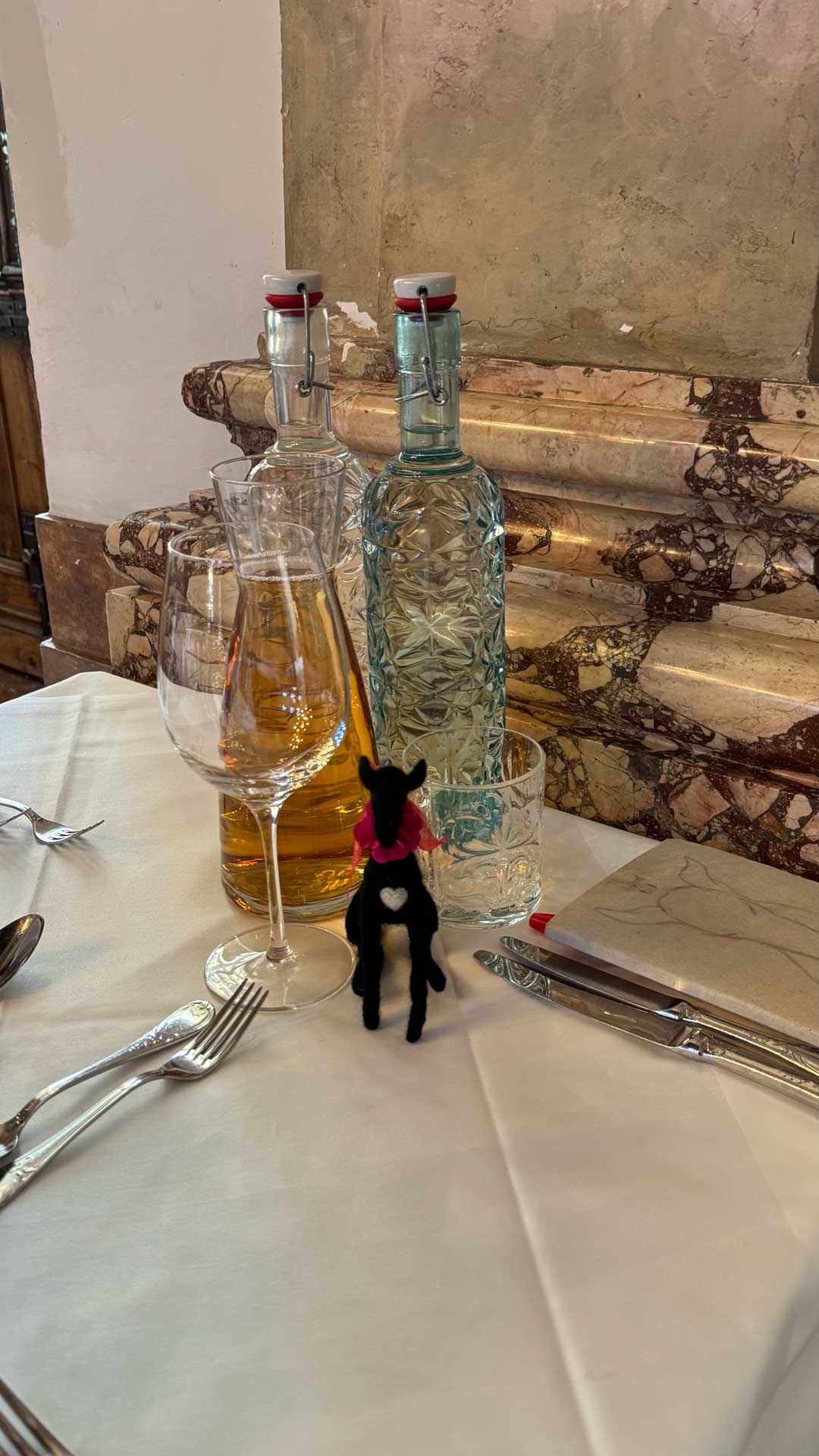 Here are photos of Lucy-stuffy and Lucy-feltie at our delightful “quiet table” in the gorgeous Marble Hall of the Schloss Leopoldskron.