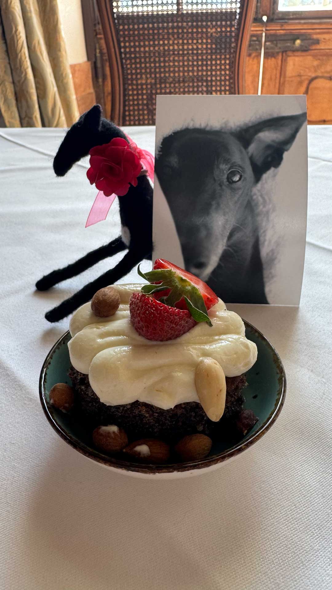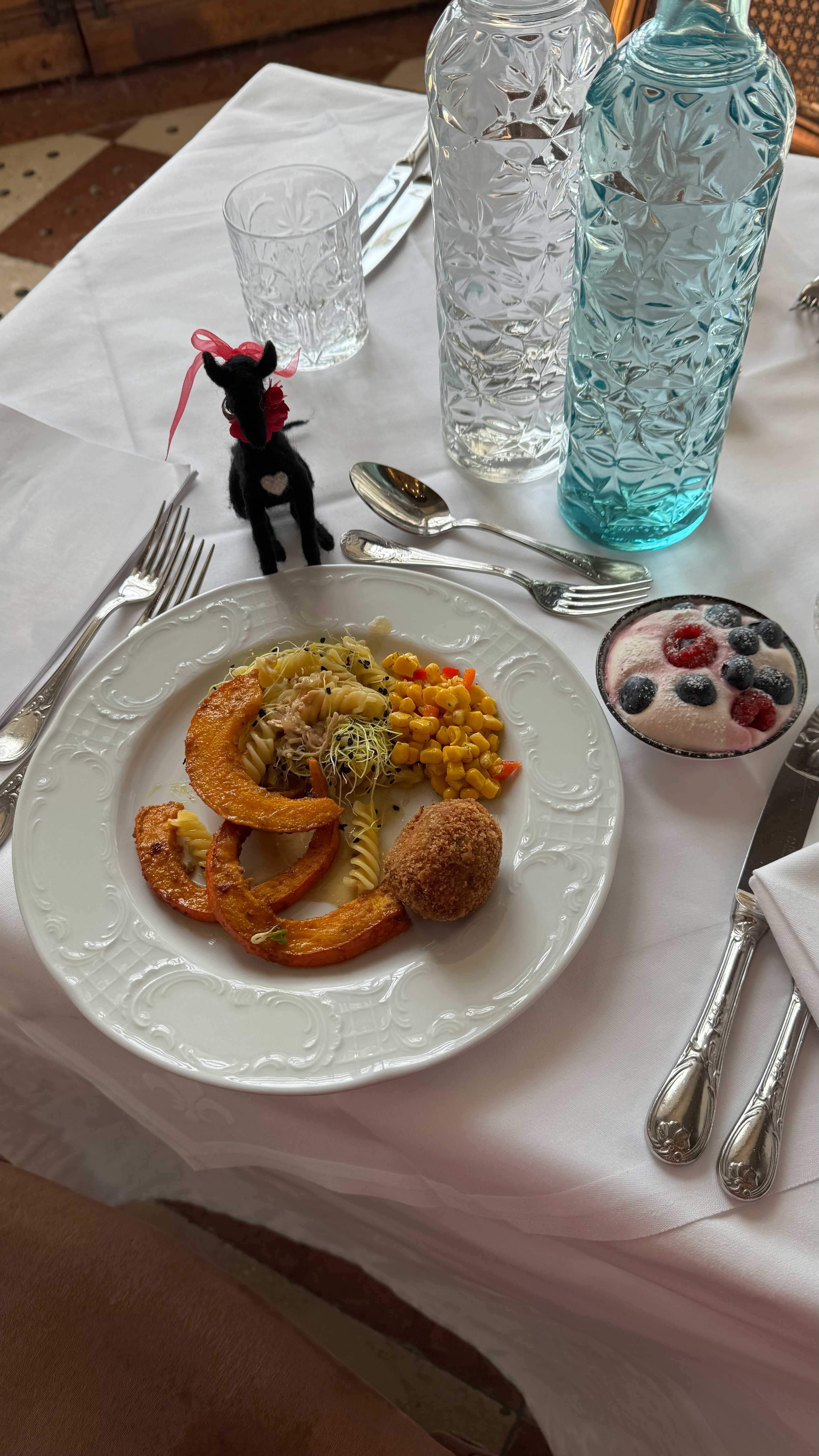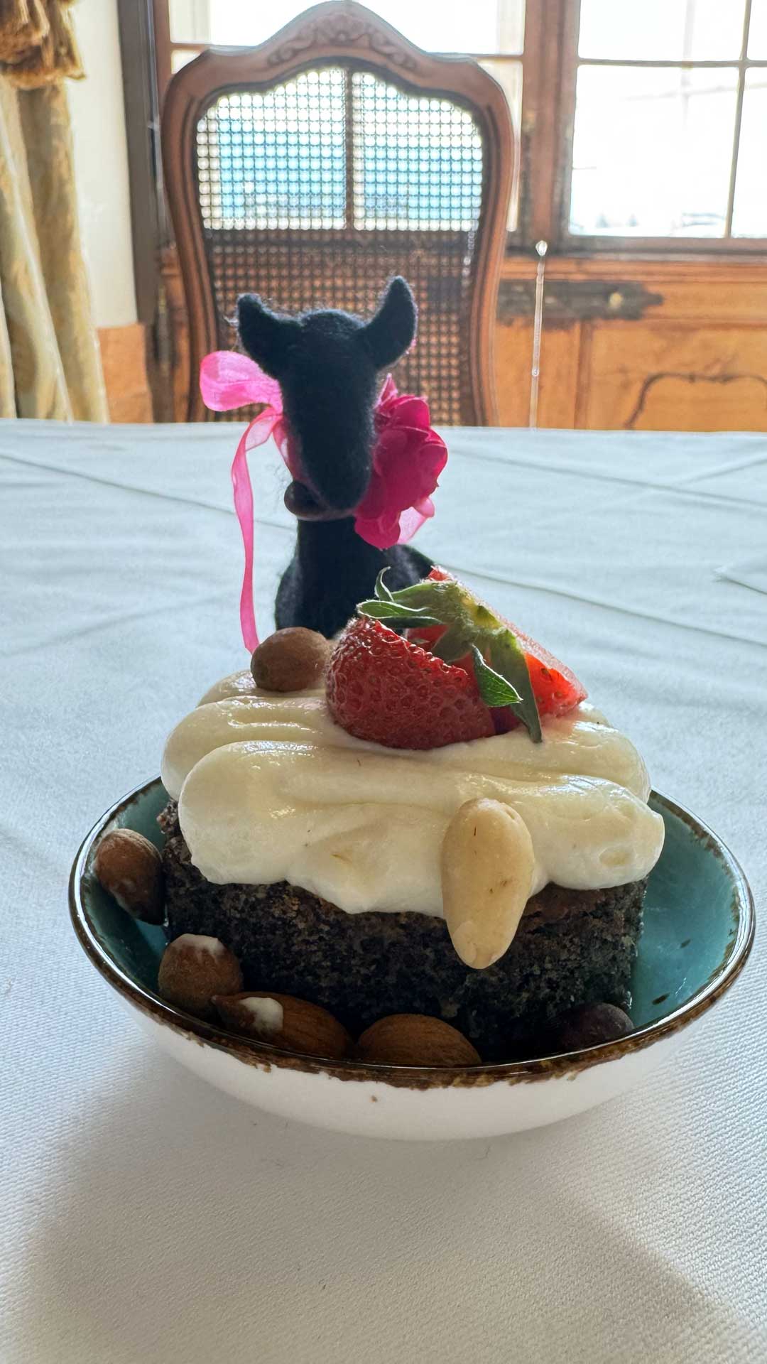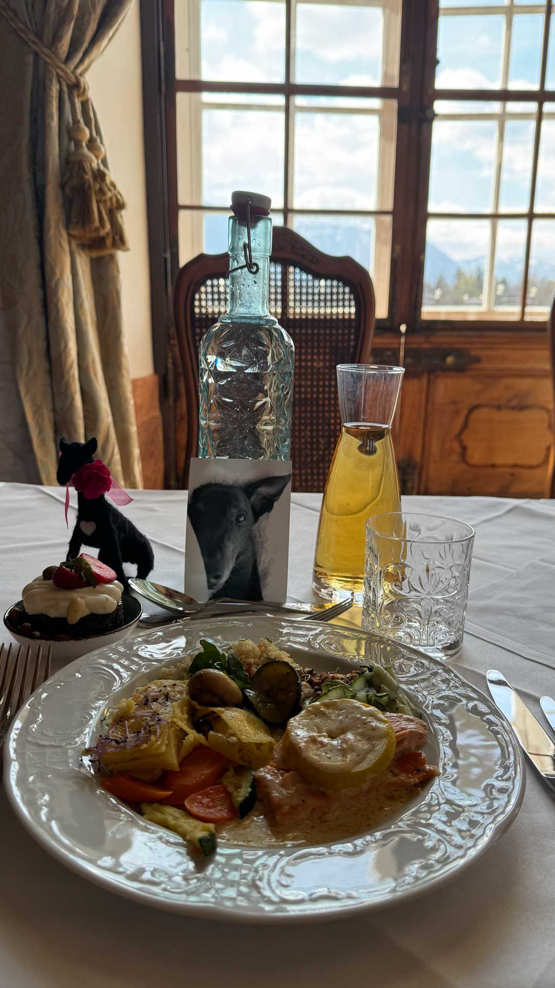 Here are photos of Lucy-stuffy and Lucy-feltie at our delightful “quiet table” in the gorgeous Marble Hall of the Schloss Leopoldskron.