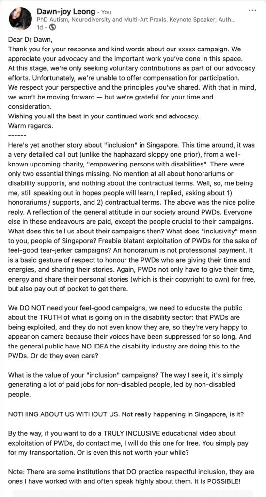 Anyway, less than a week later, I was once again approached by another entity from a newly formed charity who claim to be “dedicated to empowering persons with disabilities”, to participate in their own media campaign. Very slick, nicely polished their products look. This time, the call out was via email, and politely and professionally worded, with a great deal of detail. Sadly, two key pieces of information were missing. There was no mention of honorariums or supports for the PWDs participating, and nothing about contractual terms. In my reply, I praised the person for having written a very good call-out. I of course pointed out the two crucial missing pieces of the puzzle. But this time, perhaps because I was already quite exhausted from the previous encounter, I was a little cheeky. I informed the person that my professional fee was quite high, but I understood that this was a charity campaign and hence I was happy to consider participation if they could let me know what their honorarium would be. What I wanted the person to understand is that time, effort, energy of PWDs should be respected. A fundamental principle that people in the disability industry in Singapore do not seem to grasp. Every media company making feel-good videos feels entitled to the time, effort and energies of PWDs without any need for even the smallest gesture of regard or appreciation. On top of that, they will not even include transportation support. Filming takes time. I’ve done such freebies before, in the first few years of my return to my homeland. I did that because I wanted sincerely to create greater awareness and recognition for PWDs, in what was at the time a barren landscape. That was nine years ago. Now, PWD visibility is at an all time high, it has become almost ‘trendy’ to claim to be “inclusive”. But these “inclusive” efforts are still not honouring the time, efforts and energies of the PWDs they are claiming to “include”. An honorarium is not professional payment. It is nothing grander than a small gesture of appreciation. What is a $50-$100 honorarium per PWD to your company? Why did you not budget for simple gestures of respect and honour from the very start? Did it never occur to you? Is this the measure of your esteem for the subjects you are using to create your fabulous little programmes? A plethora of questions arise…