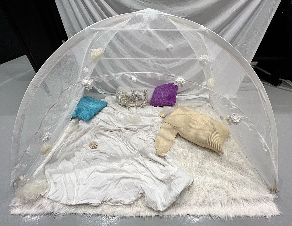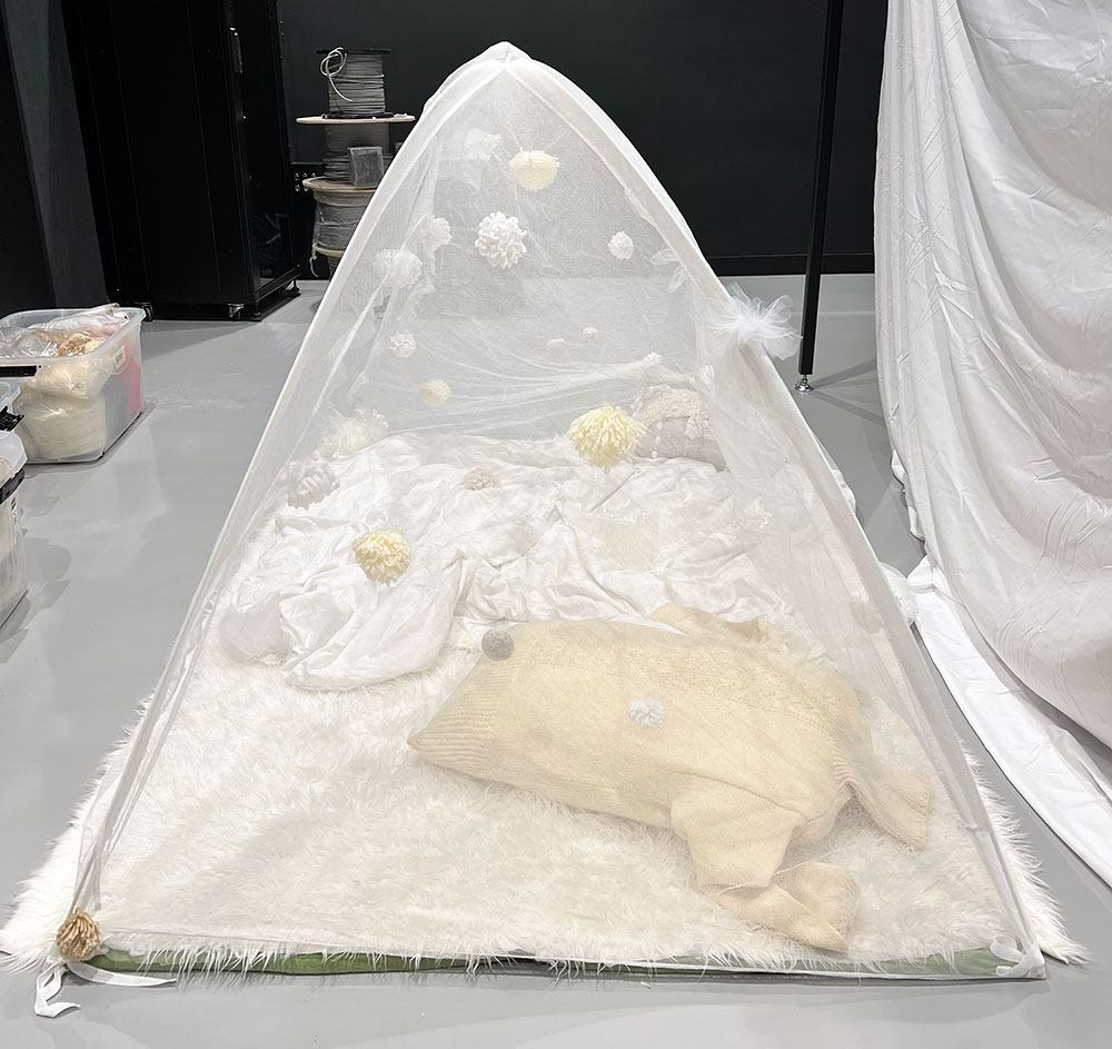 The installation space is a ‘booth’-like room with three walls. The white tent will be positioned in the centre on the ground, surrounded by two walls with colourful hanging tactile fabric panels. On the third wall, a video of my signature goldfish amidst large colourful Koi swimming around the goldfish will be projected. There will be a soundscape of Lucy’s heartbeat softly in the background.