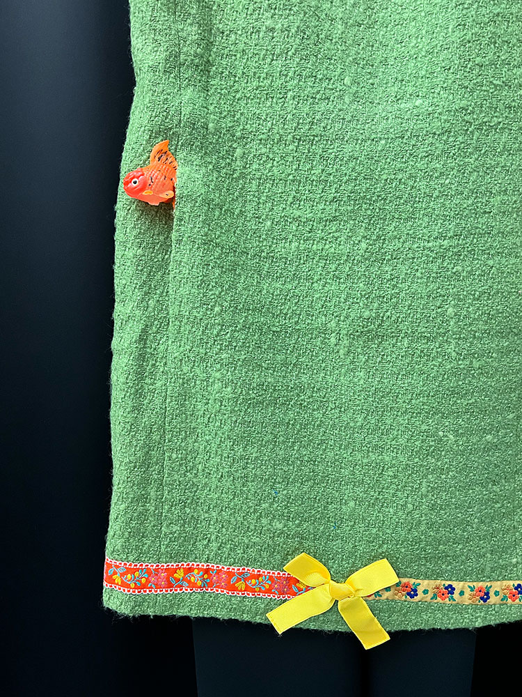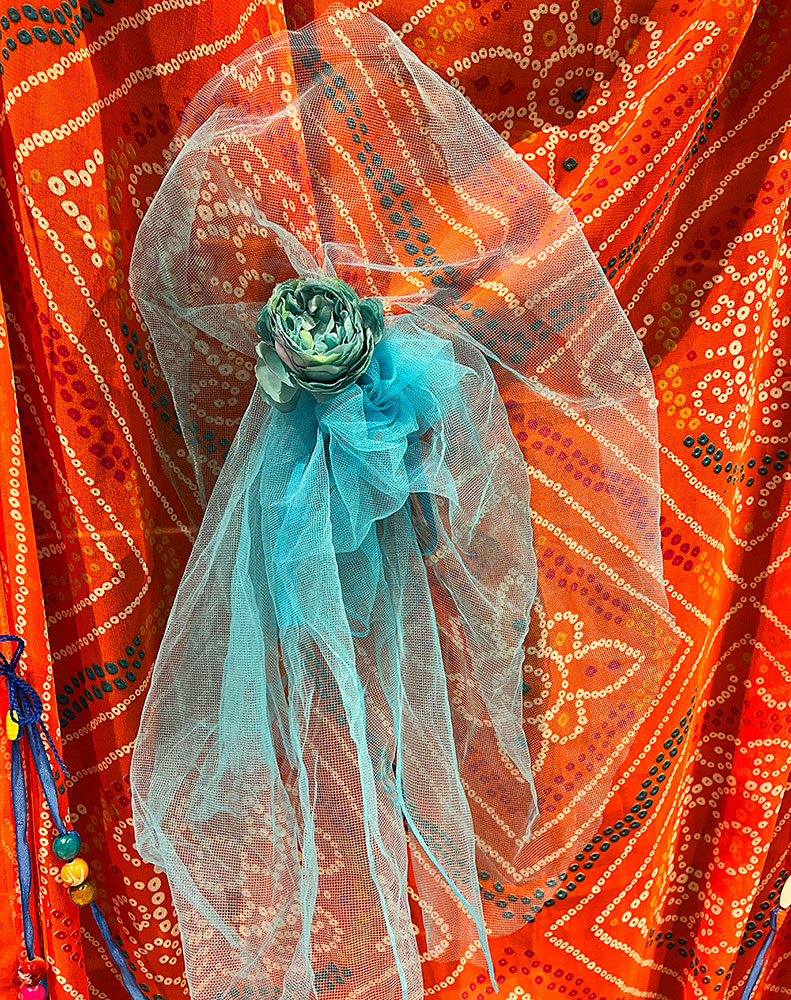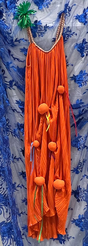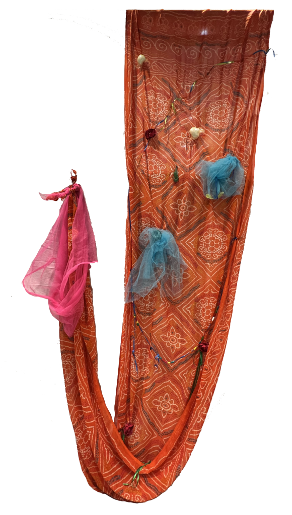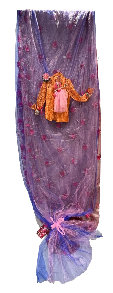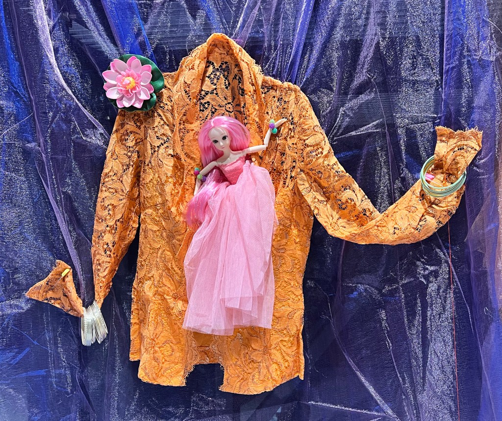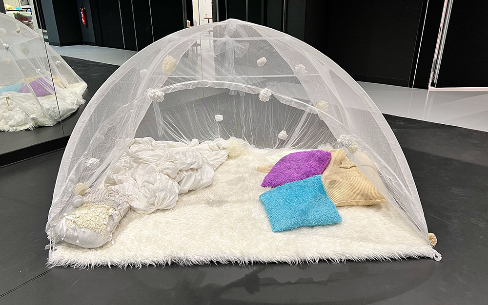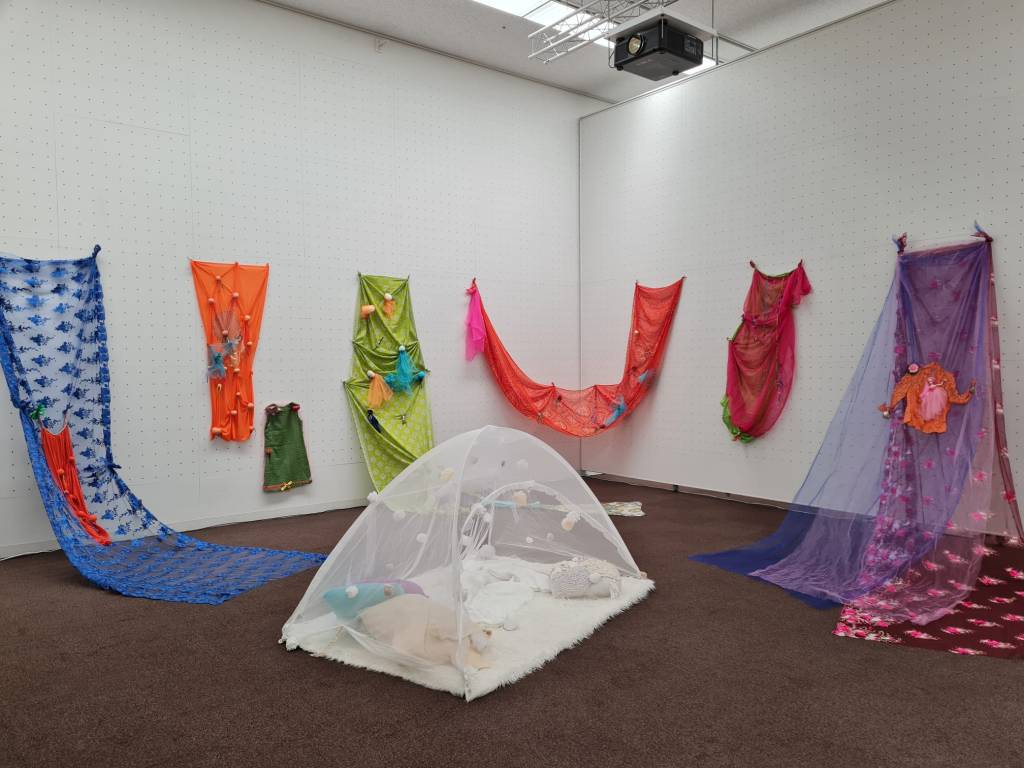 A 5 by 5 metre cubicle with 3 walls contain 6 brightly colourful panels of reworked fabric, texturised using various simple technique with string, ribbons, cotton filling, old watches and pompoms. One anchor panel of sharp deep blue lace features a bright orange dress with playful stuffed ‘balls’ tied with coloured ribbons all over the front; the other anchor panel of deep maroon lace and purple translucent gauze fabric features my mother’s bright orange lace Kebaya (a traditional Nonya blouse) with a pink doll on its front. In the middle of the cubicle sits a white netted domed tent adorned with pompoms, inside which lays a large white fluffy rug, white quilt texturised with organza and wool pompoms, a tactile pillow, a large off-white pullover reworked into a pillow, and two fluffy green and purple square cushions. My signature goldfish-Koi video from Scheherazade’s Sea is projected onto the third wall, and a soundscape of Lucy’s heartbeat plays softly in the background. A tiny teepee-like tent houses the speaker. Visitors are welcome to touch the installations and enter the tent.