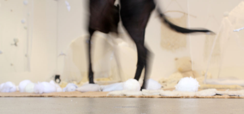Like a musical theme, photographs of Lucy in sonorous repose lead the way into the space, wherein a synergetic human-and-canine symbiosis unfolds. Inside, a continuous performance is taking place. Performance is an inevitable and essential part of autistic life within an alien social world, where autists are required to “perform the unnatural as naturally as possible.” The rendition in Sonata in Z, however, is a different kind of expression. Here, the autist-as-artist shall unfold the intrinsic: there shall be no verbal chatter, our communication shall be nonverbal, yet rich in the language of concrete consciousness. As soon as you remove your shoes (which shall be a requirement of entry) and step into this intimate interstice, you shall become part of its dynamic essence and rhythmic momentum. Explore, experience and luxuriate in myriad textures and patterns; curl up inside Lucy’s special Cuddle Cave, even fall asleep to the soundscape of her reassuring heartbeat and rhythmic breath; indulge in delicious tastes and smells; or join me in non-verbal calming ‘stimming’ activities and parallel-interaction, fashioning new objects to add to the luscious sensory tapestry each day.