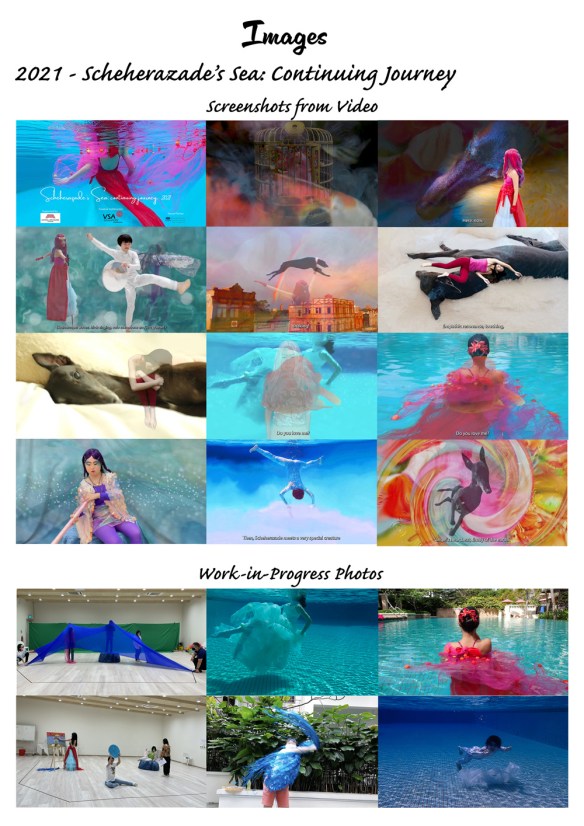 Scheherazade’s Sea: continuing journey, 2021, was the final installation in the Scheherazade’s Sea series. Departing from my previous solo performances / singular executions, this 2021 work featured a cast of artists with different disabilities, at varying stages of their artistic journeys, bringing together professional, emerging and amateur artists. The role of Scheherazade was performed by blind artist, Claire Teo, the first time this role was played by anyone other than myself. Scheherazade’s Sea: continuing journey, combined more complex digital work than previously, blended with recorded ‘live’ performance. It was presented online due to remaining Covid19 restrictions on large gatherings, and in consideration of the artists’ disabilities and compromised immunities. This work was supported by a Creation Grant from the National Arts Council, with creative collaborator ART:DIS Singapore and venue partner Tzu Chi Humanistic Youth Centre. The ‘live’ recorded segments were directed by Peter Sau, Head of Performing Arts and Artistic Development, ART:DIS. It was the first time in Singapore an Autistic artist with accompanying disabilities was awarded a mainstream grant by the NAC, not specific to “arts and disabilities.”